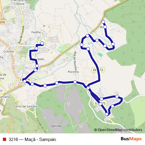The first stop of the 3216 bus route is Sampaio (Escolas) Terminal and the last stop is Maçã (R Macieira (X) EN 380). 3216 (Maçã - Sampaio) is operational during on weekdays.