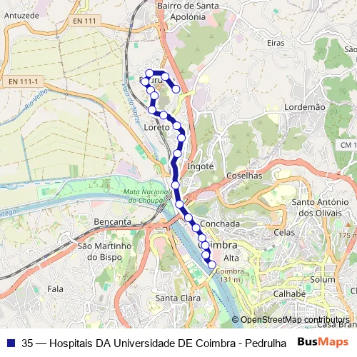 The first stop of the 35 bus route is Pedrulha (Piscinas Municipais) and the last stop is Portagem (Beira Rio). 35 (Hospitais DA Universidade DE Coimbra - Pedrulha) is operational during on weekdays.