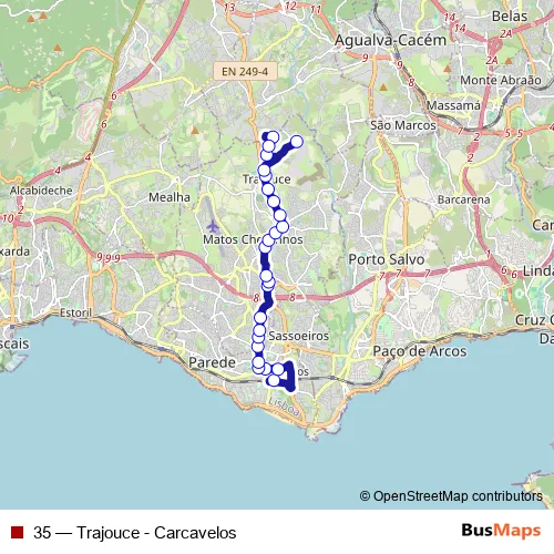 The first stop of the 35 bus route is Carcavelos - Estação - Cais 1 and the last stop is Tratolixo. 35 (Trajouce - Carcavelos) is operational during everyday.