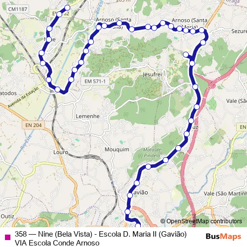 The first stop of the 358 bus route is Escola D. Maria II (Gavião) and the last stop is Bela Vista (Nine). 358 (Nine (Bela Vista) - Escola D. Maria II (Gavião) VIA Escola Conde Arnoso) is operational during on weekdays.