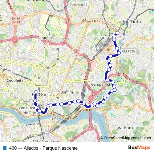 The first stop of the 400 bus route is Trindade and the last stop is Parque Nascente. 400 (Aliados - Parque Nascente) is operational during everyday.