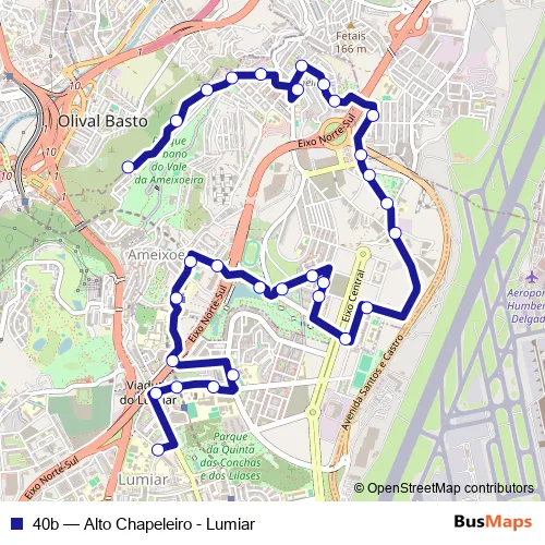 The first stop of the 40b bus route is Lumiar and the last stop is Alto Chapeleiro. 40b (Alto Chapeleiro - Lumiar) is operational during everyday.