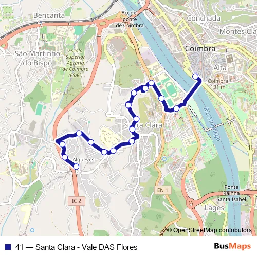 The first stop of the 41 bus route is Alqueves (Rotunda) and the last stop is Portagem. 41 (Santa Clara - Vale DAS Flores) is operational during on weekdays.