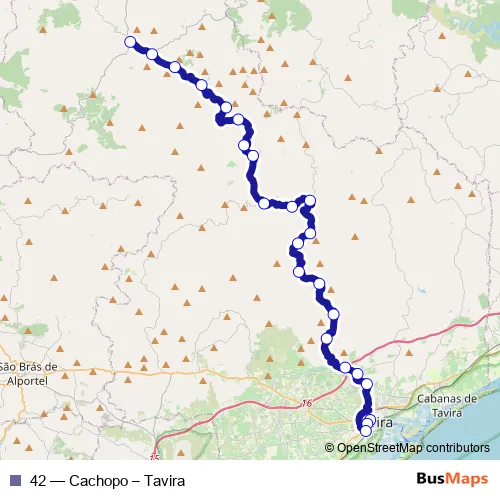 The first stop of the 42 bus route is Tavira (Terminal Rodoviário) and the last stop is Cachopo (Rotunda). 42 (Cachopo – Tavira) is operational during on weekdays.