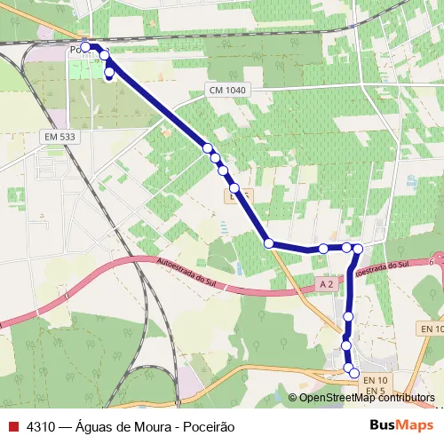 The first stop of the 4310 bus route is Poceirão (AV Palmela) X R 5 Outubro and the last stop is Águas Moura (AV Liberdade 86) Correios. 4310 (Águas de Moura - Poceirão) is operational during on weekdays.