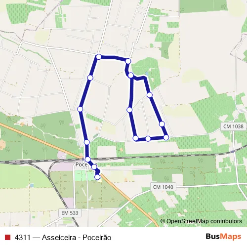 The first stop of the 4311 bus route is Escola Básica e Secundária José Saramago and the last stop is Asseiceira X R Machuqueiro. 4311 (Asseiceira - Poceirão) is operational during on weekdays.