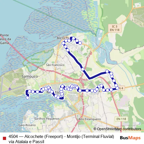 The first stop of the 4504 bus route is Cais do Seixalinho (Terminal Fluvial) P1 and the last stop is Alcochete (AV Euro 2004) Freeport. 4504 (Alcochete (Freeport) - Montijo (Terminal Fluvial) via Atalaia e Passil) is operational during everyday.