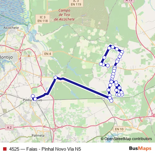The first stop of the 4525 bus route is Faias (EN 4) ESC Primária and the last stop is Pinhal Novo (ESC Secundária). 4525 (Faias - Pinhal Novo Via N5) is operational during on weekdays.