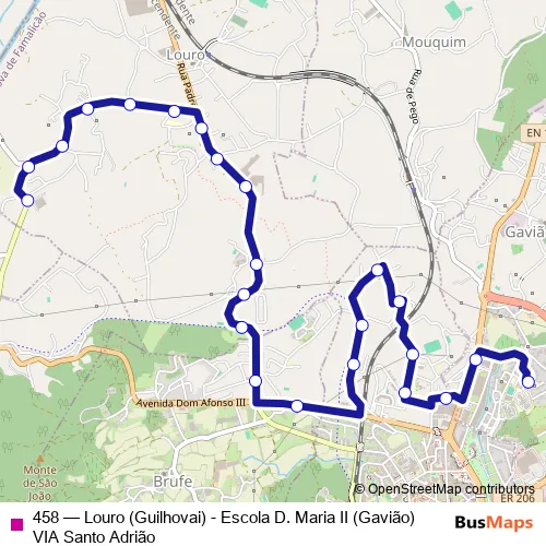 The first stop of the 458 bus route is Guilhovai (Louro) and the last stop is Escola D. Maria II (Gavião). 458 (Louro (Guilhovai) - Escola D. Maria II (Gavião) VIA Santo Adrião) is operational during on weekdays.