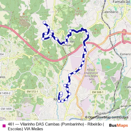 The first stop of the 461 bus route is Escola Básica (Ribeirão) and the last stop is Pombarinho (Vilarinho DAS Cambas). 461 (Vilarinho DAS Cambas (Pombarinho) - Ribeirão (Escolas) VIA Meães) is operational during on weekdays.