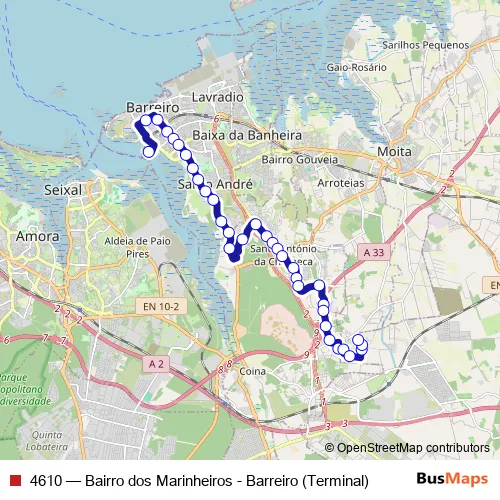 See why over 2 million users trust and consider busmaps.com as the best public transport website. busmaps gives you Barreiro Buses suggested routes, real-time bus tracker, line route maps in Barreiro, and helps to find the closest 4610 bus stops near you. No internet available? Download an offline PDF map and bus schedule for the 4610 bus to take on your trip.