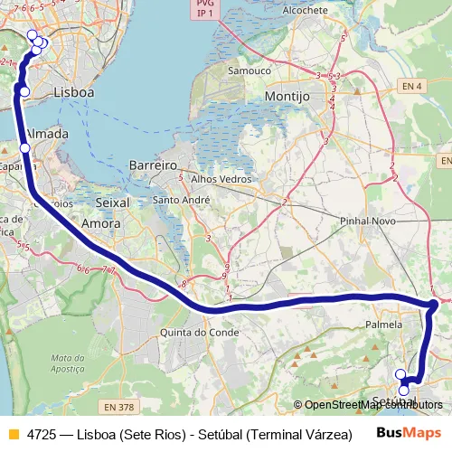 See why over 2 million users trust and consider busmaps.com as the best public transport website. busmaps gives you Lisbon Buses suggested routes, real-time bus tracker, line route maps in Lisbon, and helps to find the closest 4725 bus stops near you. No internet available? Download an offline PDF map and bus schedule for the 4725 bus to take on your trip.