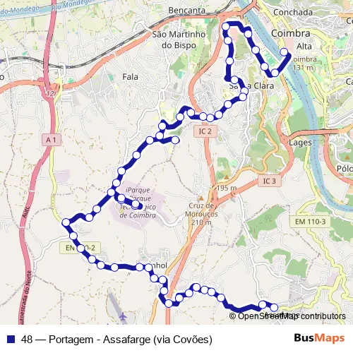 The first stop of the 48 bus route is Portagem (Beira Rio) and the last stop is Assafarge (X). 48 (Portagem - Assafarge (via Covões)) is operational during everyday.