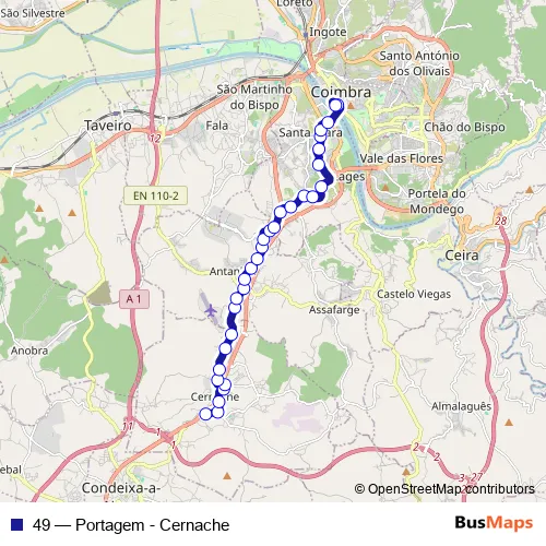 The first stop of the 49 bus route is Cernache (Interface de Casconha) and the last stop is Portagem (Beira Rio). 49 (Portagem - Cernache) is operational during everyday.
