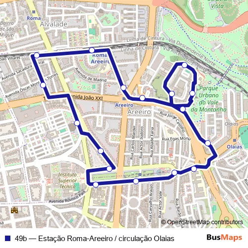 The first stop of the 49b bus route is Estação Roma-Areeiro and the last stop is Estação Roma-Areeiro. 49b (Estação Roma-Areeiro / circulação Olaias) is operational during on weekdays.