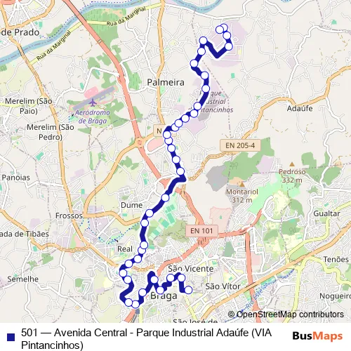 The first stop of the 501 bus route is Central Iv and the last stop is Baltazar A Simões. 501 (Avenida Central - Parque Industrial Adaúfe (VIA Pintancinhos)) is operational during on weekdays.