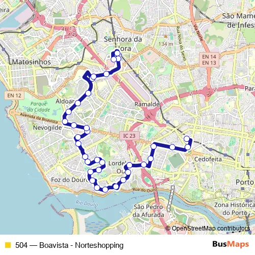 The first stop of the 504 bus route is Casa DA Música (Metro) and the last stop is Norteshopping. 504 (Boavista - Norteshopping) is operational during everyday.