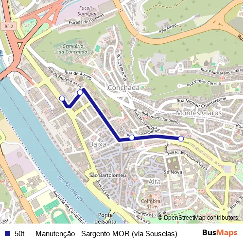 The first stop of the 50t bus route is Manutenção and the last stop is Largo do Arnado (Av. Fernão de Magalhães). 50t (Manutenção - Sargento-MOR (via Souselas)) is operational during everyday.