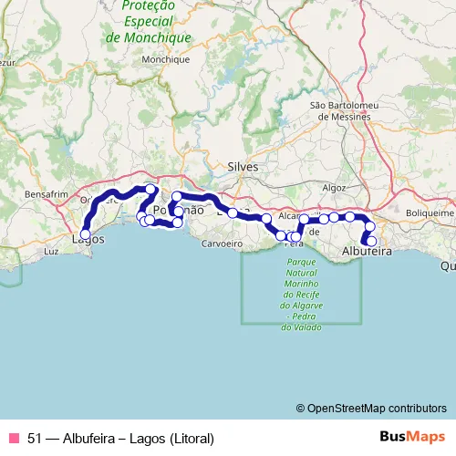 The first stop of the 51 bus route is Lagos (Terminal Rodoviário) and the last stop is Albufeira (Terminal Rodoviário). 51 (Albufeira – Lagos (Litoral)) is operational during everyday.