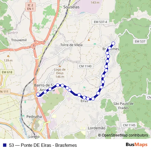 The first stop of the 53 bus route is Brasfemes (Rotunda) and the last stop is Ponte de Eiras (Interface). 53 (Ponte DE Eiras - Brasfemes) is operational during everyday.
