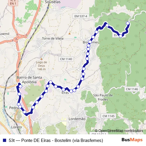 The first stop of the 53t bus route is Ponte de Eiras (Interface) and the last stop is Mata do Maxial (X). 53t (Ponte DE Eiras - Bostelim (via Brasfemes)) is operational during on weekdays.