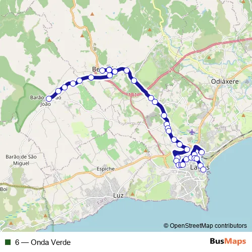 The first stop of the 6 bus route is Barão São João and the last stop is Praça do Infante. 6 (Onda Verde) is operational during everyday.