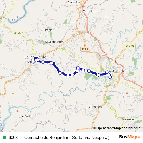 The first stop of the 6008 bus route is Sertã (Terminal) and the last stop is Cernache do Bonjardim (Mercado). 6008 (Cernache do Bonjardim - Sertã (via Nesperal)) is operational during on weekdays.