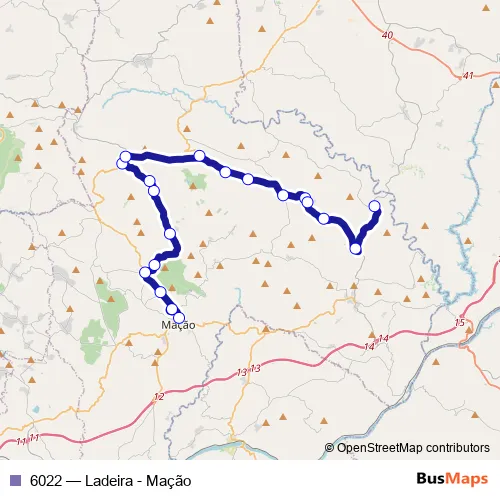 The first stop of the 6022 bus route is Mação (Largo dos Bombeiros) and the last stop is Ladeira. 6022 (Ladeira - Mação) is operational during on weekdays.