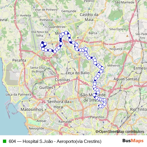 The first stop of the 604 bus route is Aeroporto and the last stop is Hosp. S. João (Metro). 604 (Hospital S.João - Aeroporto(via Crestins)) is operational during everyday.