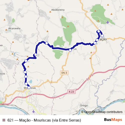 The first stop of the 621 bus route is Mação (Largo dos Bombeiros) and the last stop is Mouriscas (Centro). 621 (Mação - Mouriscas (via Entre Serras)) is operational during on weekdays.