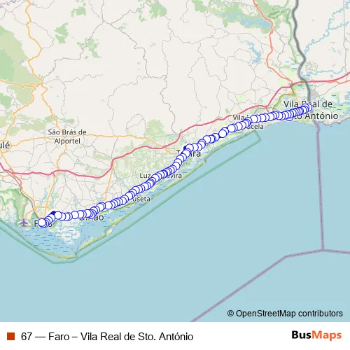 The first stop of the 67 bus route is VRS António (Terminal Rodoviário) and the last stop is Faro (Terminal Rodoviário). 67 (Faro – Vila Real de Sto. António) is operational during everyday.