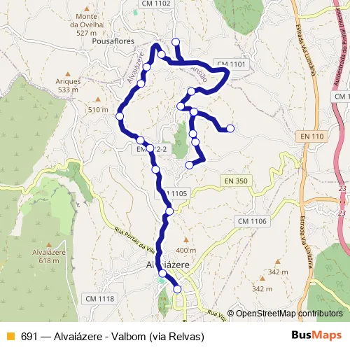 The first stop of the 691 bus route is Quinta São Gens (X) and the last stop is Alvaiázere (Escola). 691 (Alvaiázere - Valbom (via Relvas)) is operational during on weekdays.