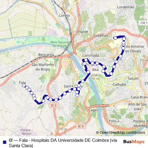 The first stop of the 6f bus route is Fala (X) and the last stop is Hospitais da Universidade (Este). 6f (Fala - Hospitais DA Universidade DE Coimbra (via Santa Clara)) is operational during everyday.