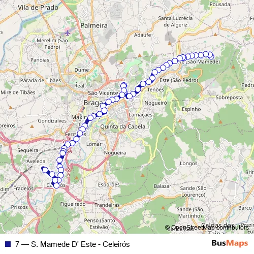 The first stop of the 7 bus route is Paço and the last stop is 17 DE Dezembro (Celeirós). 7 (S. Mamede D' Este - Celeirós) is operational during everyday.