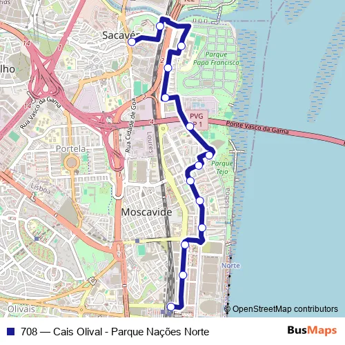 The first stop of the 708 bus route is Estação Oriente and the last stop is Sacavém (Urb. Real Forte). 708 (Cais Olival - Parque Nações Norte) is operational during everyday.