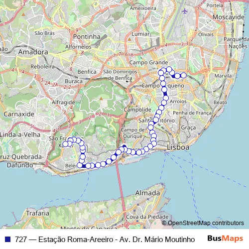 The first stop of the 727 bus route is Estação Roma-Areeiro and the last stop is Restelo - Av. Descobertas. 727 (Estação Roma-Areeiro - Av. Dr. Mário Moutinho) is operational during everyday.