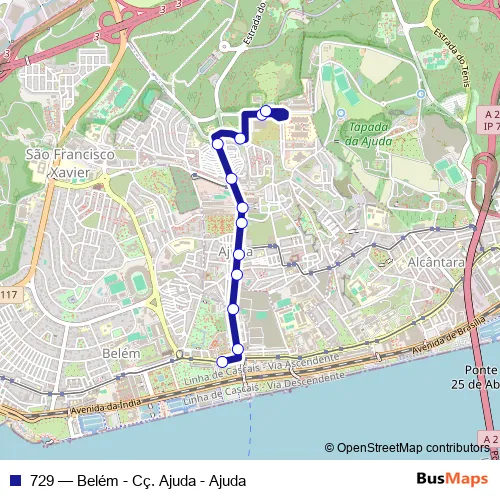 The first stop of the 729 bus route is Belém and the last stop is Pólo Universitário Ajuda. 729 (Belém - Cç. Ajuda - Ajuda) is operational during everyday.