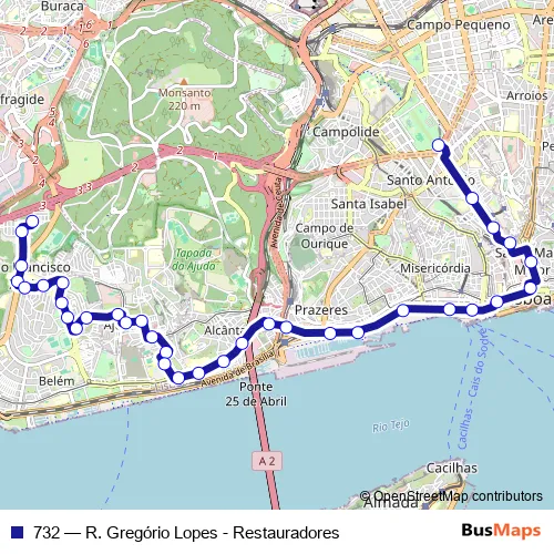 The first stop of the 732 bus route is Caselas and the last stop is Marquês Pombal. 732 (R. Gregório Lopes - Restauradores) is operational during on weekends.