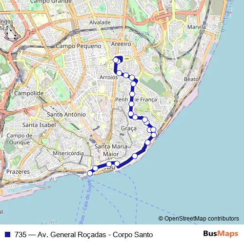 The first stop of the 735 bus route is Cais Sodré and the last stop is Alameda D. A. Henriques. 735 (Av. General Roçadas - Corpo Santo) is operational during everyday.