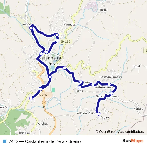 The first stop of the 7412 bus route is Castanheira de Pêra (Central) and the last stop is Soeiro. 7412 (Castanheira de Pêra - Soeiro) is operational during on weekdays.