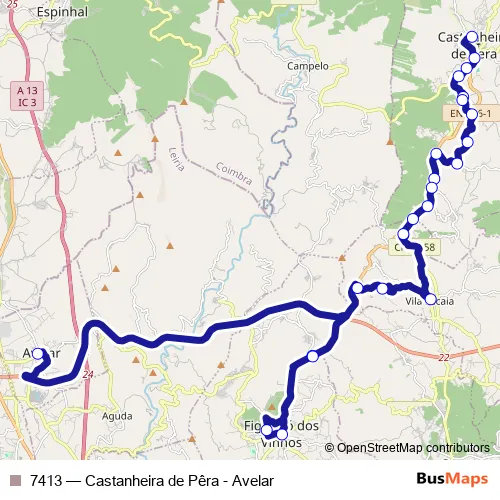 The first stop of the 7413 bus route is Castanheira de Pêra (Central) and the last stop is Avelar (R. Nova). 7413 (Castanheira de Pêra - Avelar) is operational during on weekdays.