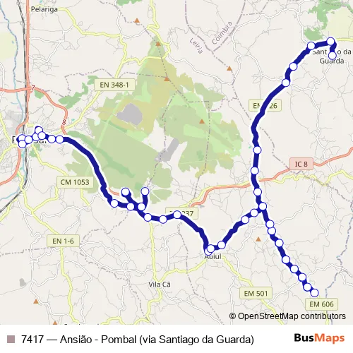 The first stop of the 7417 bus route is Pombal (Terminal) and the last stop is Santiago da Guarda (Igreja). 7417 (Ansião - Pombal (via Santiago da Guarda)) is operational during on weekdays.