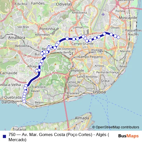 The first stop of the 750 bus route is Cabo Ruivo - Av. Mar. Gomes Costa and the last stop is Algés. 750 (Av. Mar. Gomes Costa (Poço Cortes) - Algés (Mercado)) is operational during on weekdays.