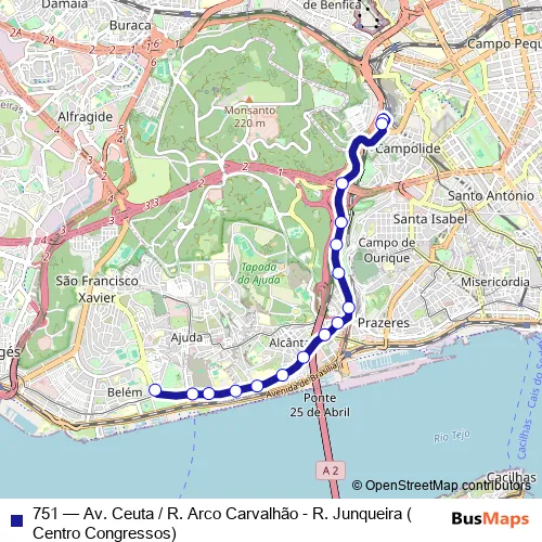 The first stop of the 751 bus route is Estação Campolide and the last stop is Mosteiro Jerónimos. 751 (Av. Ceuta / R. Arco Carvalhão - R. Junqueira (Centro Congressos)) is operational during on weekdays.
