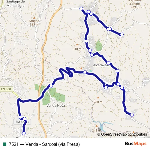 The first stop of the 7521 bus route is Sardoal (Av. Heróis do Ultramar) and the last stop is Venda. 7521 (Venda - Sardoal (via Presa)) is operational during on weekdays.