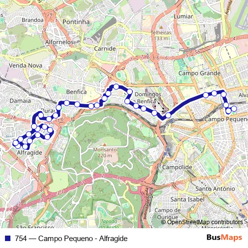 The first stop of the 754 bus route is Alfragide and the last stop is Campo Pequeno. 754 (Campo Pequeno - Alfragide) is operational during on weekdays.