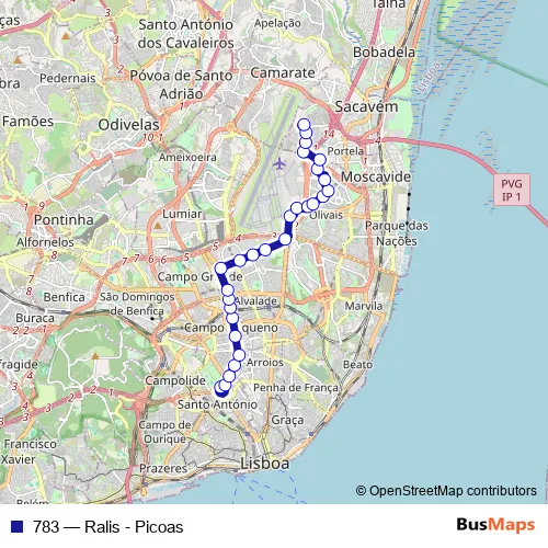 The first stop of the 783 bus route is Marquês Pombal and the last stop is Prior Velho. 783 (Ralis - Picoas) is operational during on weekends.
