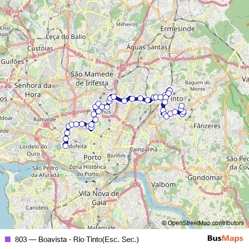 The first stop of the 803 bus route is Boavista - B.Sucesso and the last stop is RIO Tinto (Esc. Sec.). 803 (Boavista - Rio Tinto(Esc. Sec.)) is operational during everyday.