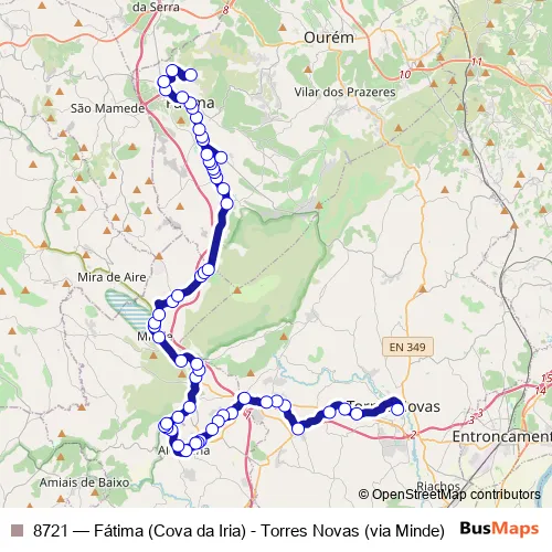 The first stop of the 8721 bus route is Minde (Mercado) and the last stop is Torres Novas (Terminal). 8721 (Fátima (Cova da Iria) - Torres Novas (via Minde)) is operational during on weekdays.