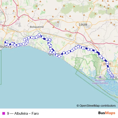 The first stop of the 9 bus route is Faro (Terminal Rodoviário) and the last stop is Albufeira (Terminal Rodoviário). 9 (Albufeira – Faro) is operational during everyday.